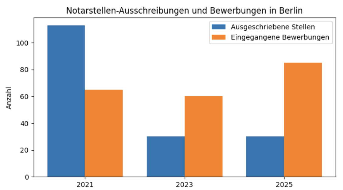 Dass ebenjene Hoffnung dringend Realität werden muss, zeigen die vom Senat vorgelegten Zahlen bezüglich der eingegangenen Bewerbungen seit 2021 und den jeweiligen Bewerbungskampagnen. In den Bewerbungskampagnen 2021, 2023 und 2025 wurden in Berlin insgesamt 173 Notarstellen ausgeschrieben. Gleichzeitig stieg die Zahl der Bewerbungen zuletzt wieder an, während die Verfahren teils weiterhin außergewöhnlich lange offenbleiben.